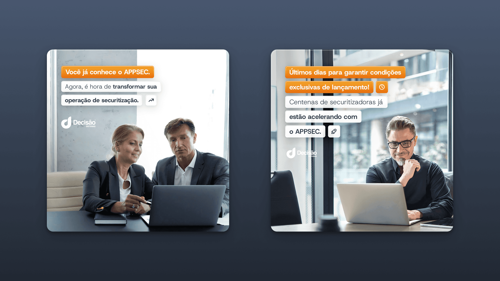 Ao refinar e expandir a paleta laranja principal do produto e adicionar um novo sistema iconográfico, projetei uma campanha onde o grid “se construía”: desde células mínimas no pré-lançamento até um grid completo e robusto no lançamento. Esse sistema modular foi implementado de forma coesa, dos ads à landing page, posicionando o APPSEC como uma solução confiável e organizada para o mercado de securitização.